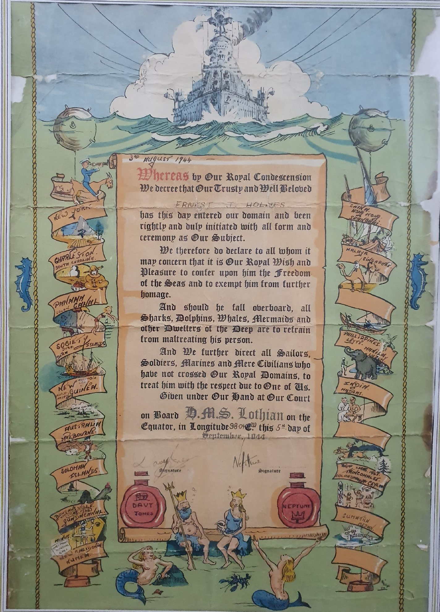They grant Ernest J. Holmes and Stephen James Taylor, freedom of the sea and asks if they fall overboard that all Sharks, Dolphins, Whales, Mermaids and Dwellers of the Deep refrain from maltreating them.Don't forget you can Click on the photo to enlarge it's worth it.
