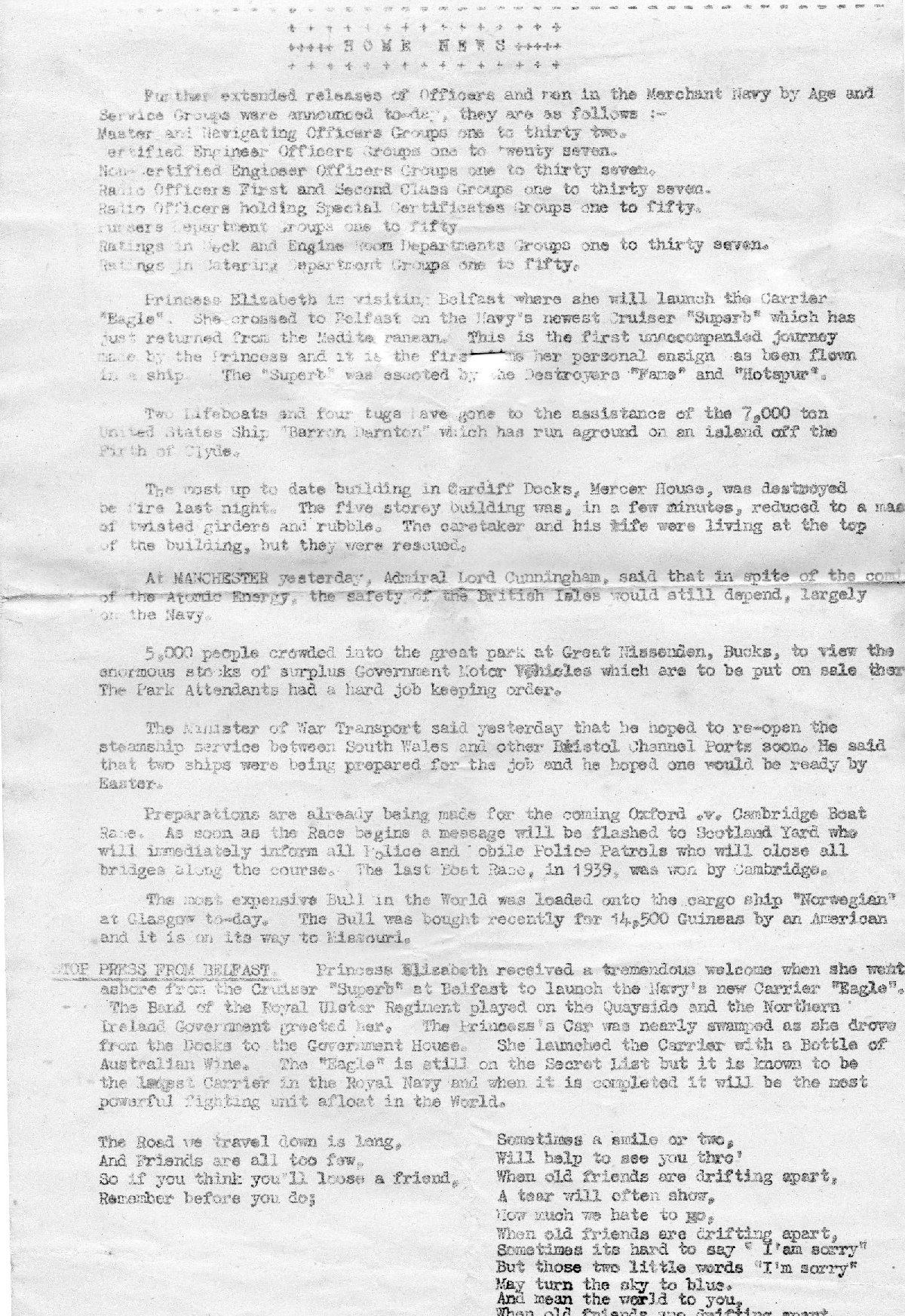 "When the ships role was changed at the end of February 1945 I and several others were sent back to the UK in the cruiser HMS Newcastle."