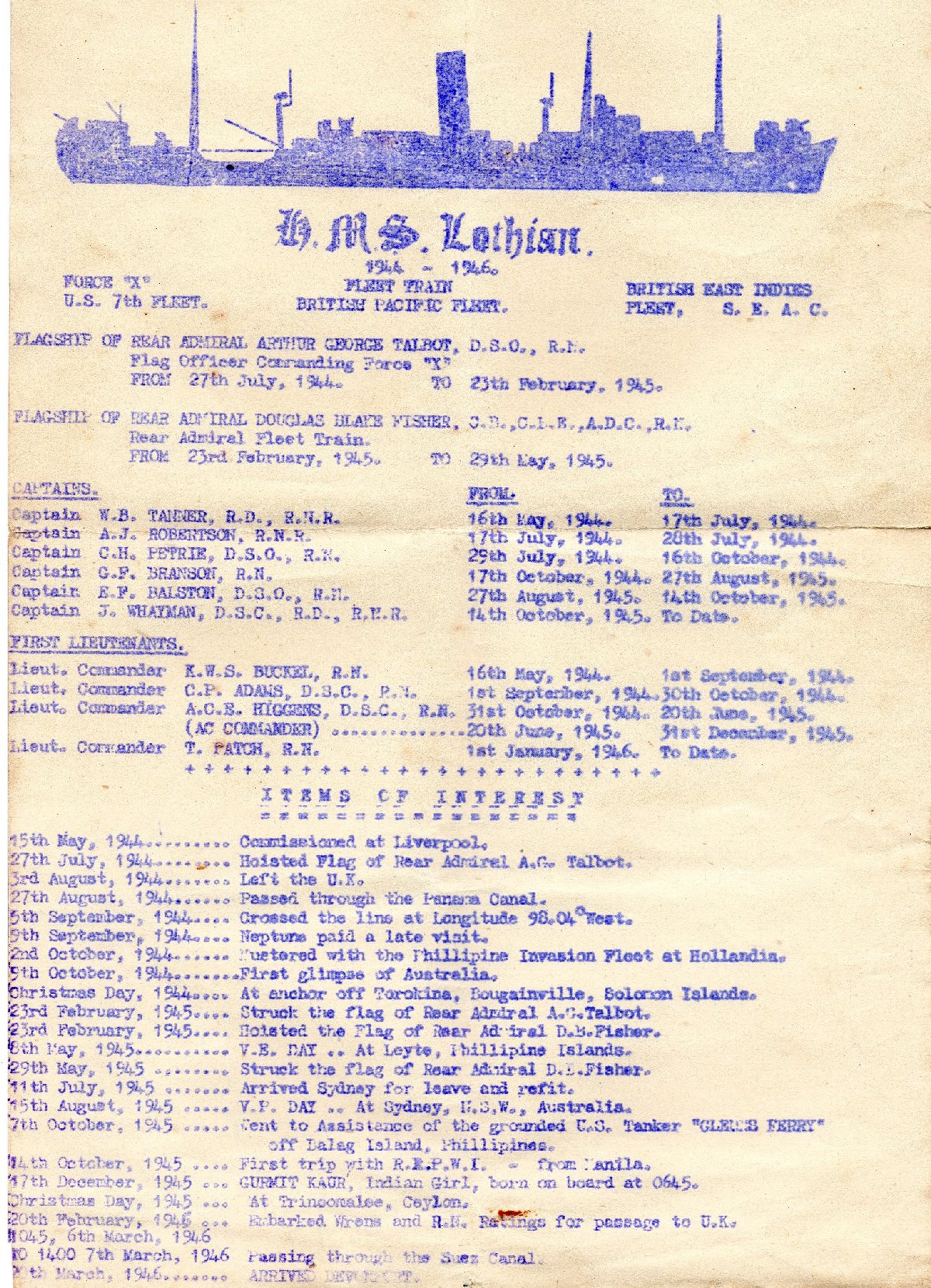 16th May 1944 - 3rd May 1945 HMS Lothian (I have the history of HMS Lothian and the mutiny)
