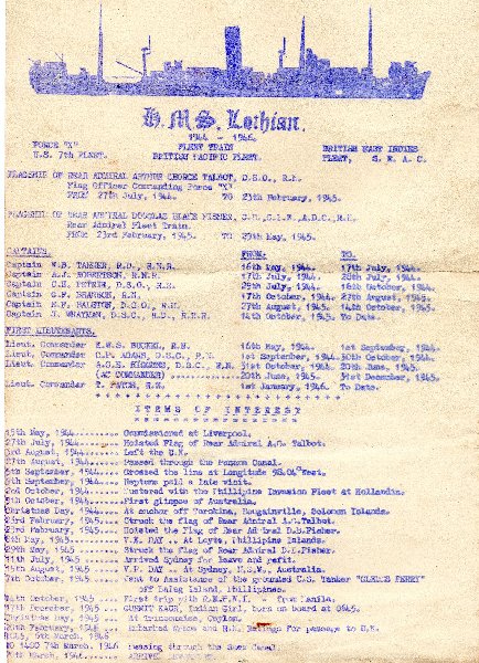 Going through some old family photos and documents my sister and I found these and thought there might be people out there who recognise some of these people and would like a photo. So here they are along with a copy of some sort HMS Lothian log, listing Captains and items of interest (even 1 birth) between 1944-1946. And a copy of the HMS Lothian's Daily News. Also there's some History found on the web.If you know anyone in the pictures or anything about the ship get in touch and share it