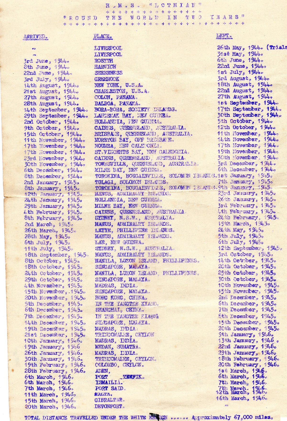 SHIPS LOG1944-46 (67,000 miles)