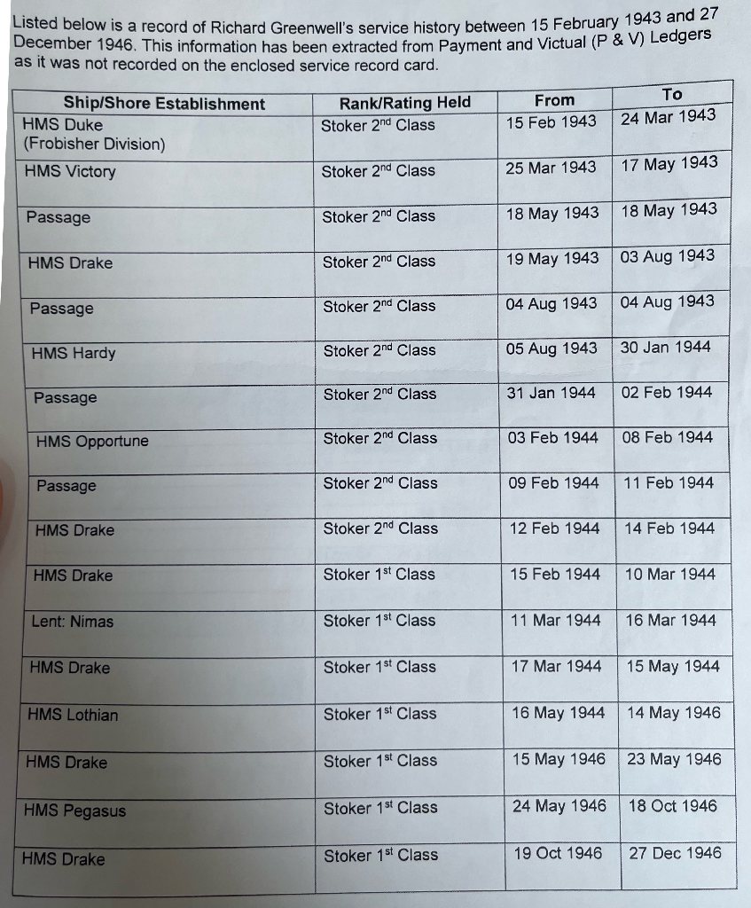 Sent in by Grand daughter Leah. Richard Greenwell's Service History, if you want yours or your relative's Service History you can get it https://www.gov.uk/government/publications/military-service-records-form and there is no charge.
