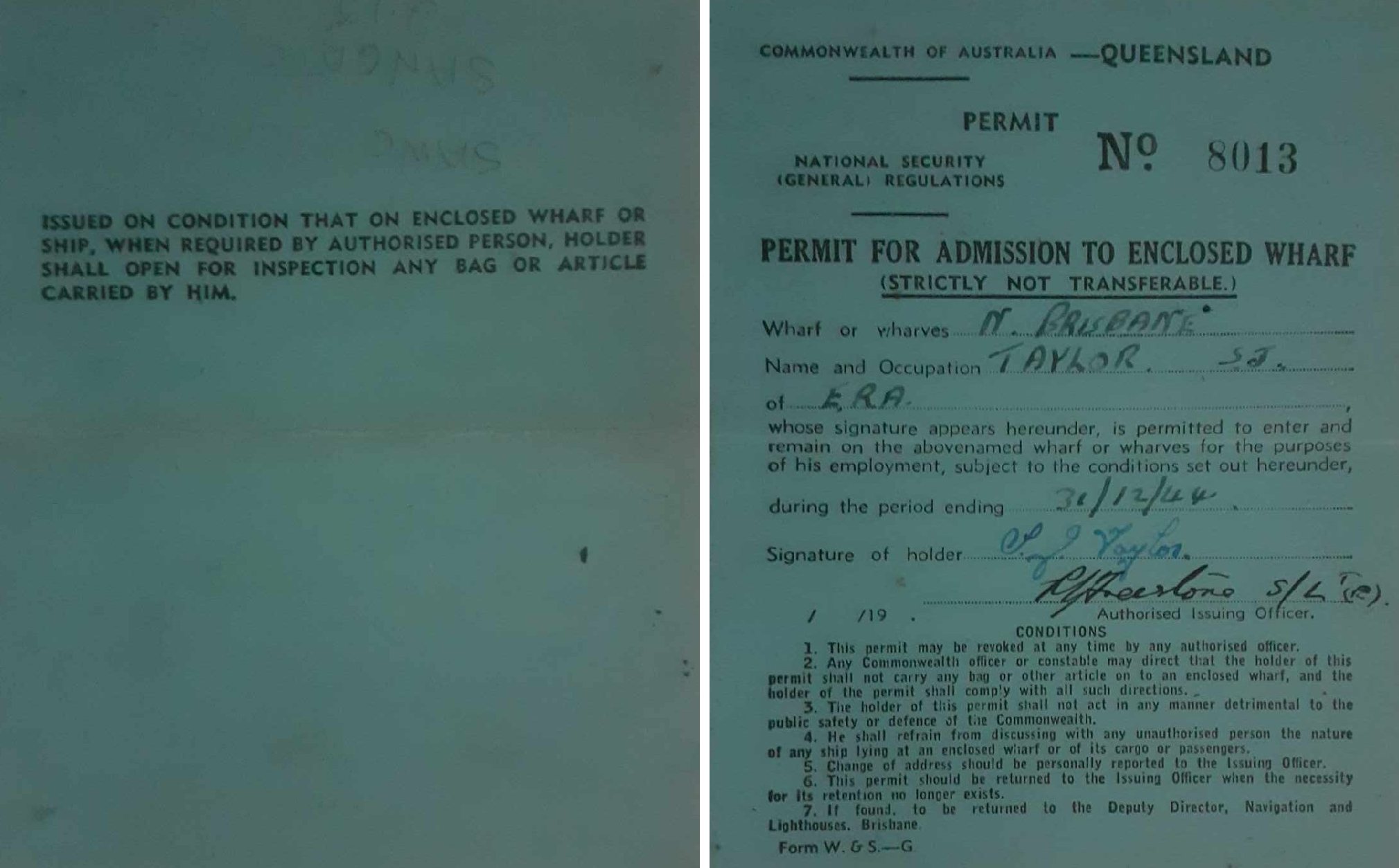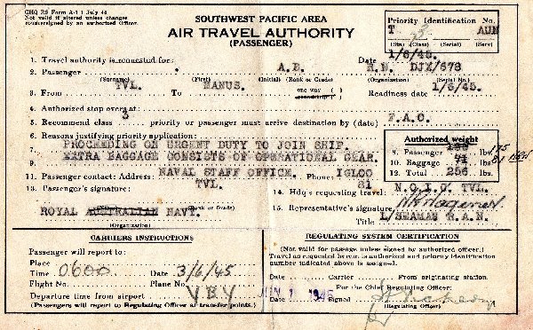Sadly I did not find any Naval photo's but I did find a Pass Card as attached. It puts my Father in Brisbane Port on New Year's Eve 1944.